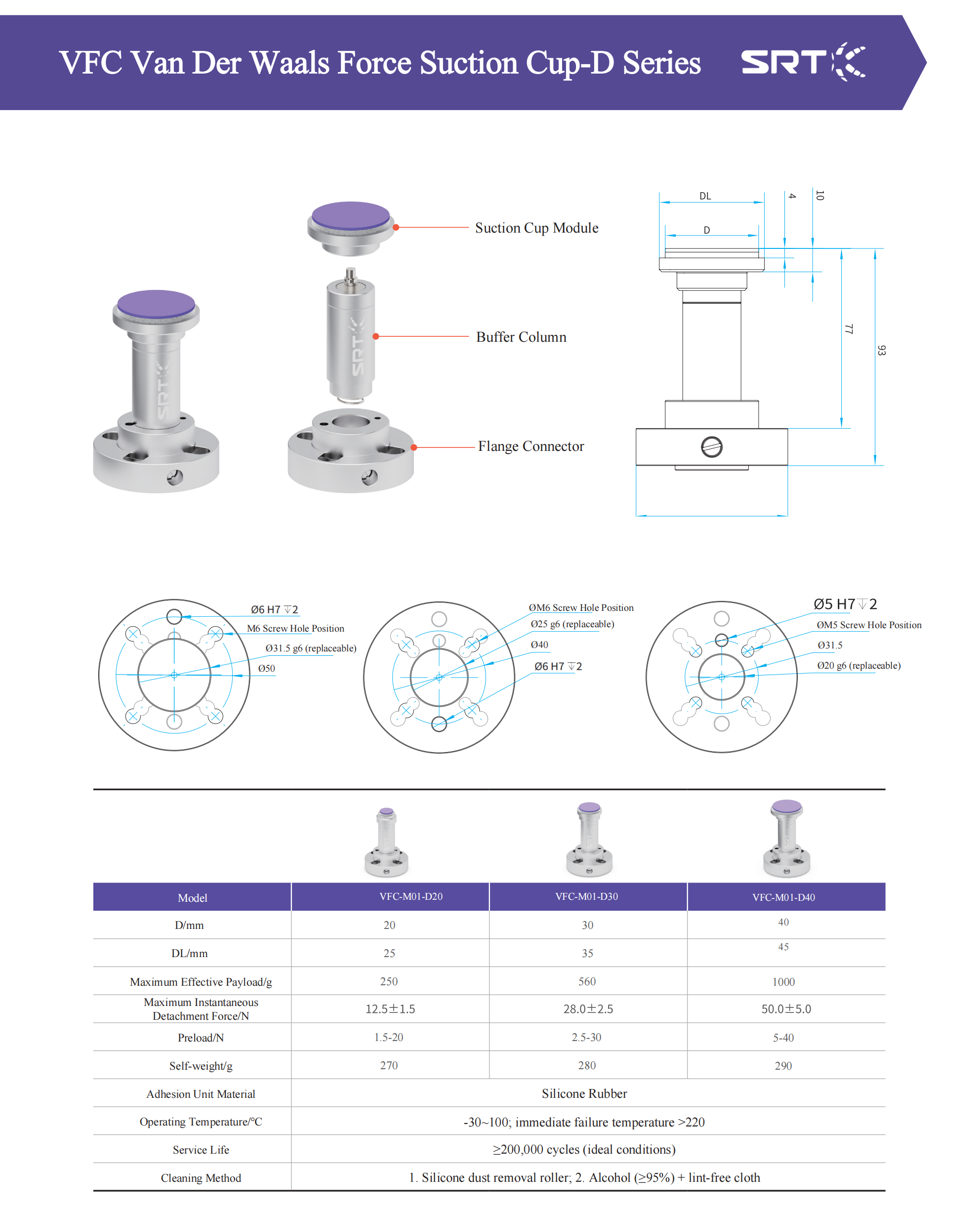 VFC Van Der Waals force suction cups are inspired by the observation and imitation of the microscopic characteristics of gecko feet. Through special polymer materials and μm-level surface micro-molding processes, the suction cups can generate strong intermolecular forces with the surface of various objects to absorb. The strength can reach 0.5kg/cm². Thanks to its special adsorption mechanism, it does not require a power supply, a gas supply, or programming. It is simple and reliable, and can absorb porous workpieces, and can work normally even in a vacuum environment. In addition, there are no residues and marks on the surface of the workpiece, which greatly expands the application scope of automatic equipment.